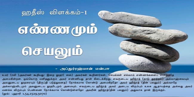 உமர் (ரலி )அவர்கள் கூறியது : இறை தூதர்( ஸல்) அவர்கள் கூறினார்கள், செயல்கள் எல்லாம் எண்ணங்களைப் பொறுத்தே அமைகின்றன .ஒவ்வொரு மனிதனுக்கும் அவர் எண்ணியது தான் கிடைக்கிறது. எவருடைய ஹிஜ்ரத் (நாடு துறத்தல் ) அல்லாஹ்வையும் அவனுடைய தூதரையும் (திருப்தி படுத்துவதை ) நோக்கமாக கொண்டு அமைகிறதோ அவர் ஹிஜ்ரத் (தின் பலனும்) அவ்வாறே அல்லாஹ்விடமும் அவனுடைய தூதரிடமும் அமையும். எவருடைய ஹிஜ்ரத் அவர் அடைய விரும்பும் உலக ஆதாயத்தை அல்லது அவர் மணக்க விரும்பும் பெண்ணை நோக்கமாக கொண்டுள்ளதோ அவரின் ஹிஜ்ரத்(தின் பலனும்) அதுவாக தான் இருக்கும். (நூல் : புஹாரி